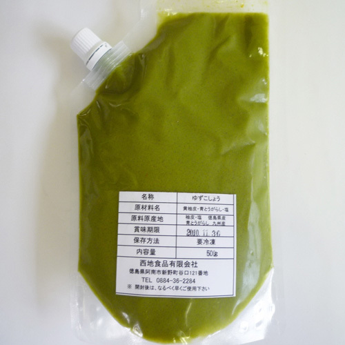 Used yellow yuzu peels from Tokushima, salt from Naruto, green peppers from Kyushu as ingredients. It needs to be refrigerated, but can be used right after you take out from the refrigerator because it does not freeze hard. Once you open, the freshness will last longer if stored in the freezer.